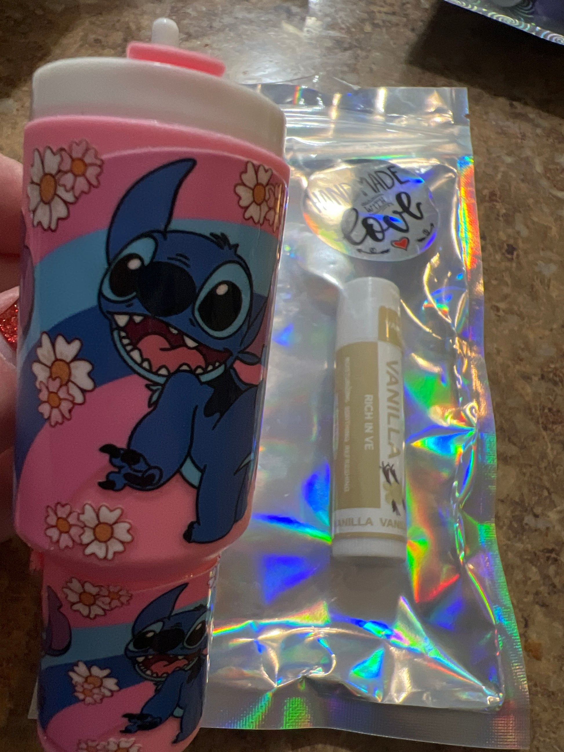 Stitch pink with rainbow and flowers