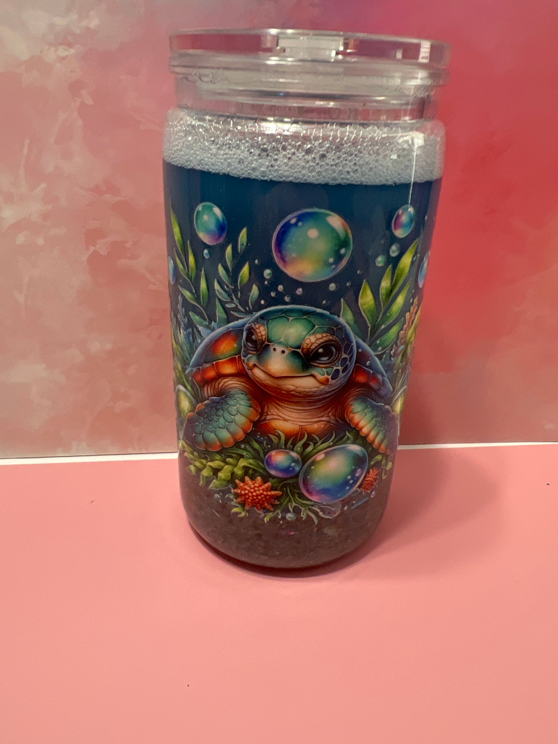 This turtle tumbler is 16 oz acrylic beach themed with the sand and a bunch of fish and little turtles.